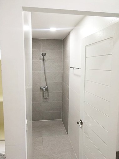 – modern bathroom with water heater and walk-in shower